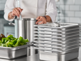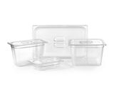 Ono što ovu liniju čini izuzetno praktičnom jeste potpuna transparentnost materijala, koja šefovima kuhinja omogućava trenutnu identifikaciju sadržaja bez potrebe za otvaranjem posuda, čime se sprečava nepotreban gubitak temperature i štedi vreme. Integrisane merne skale na zidovima olakšavaju precizno doziranje i praćenje količine zaliha. Poput inox varijanti, polikarbonatne posude prate stroge Gastronorm standarde i dolaze sa zaobljenim unutrašnjim uglovima koji sprečavaju zadržavanje bakterija i olakšavaju pranje. Dostupne su u svim standardnim formatima — od najvećih GN 1/1 i GN 1/2, preko GN 1/3 i GN 1/4, do najmanjih GN 1/6 i GN 1/9 — sa dubinama od 65, 100, 150 i 200 mm, pružajući maksimalnu fleksibilnost u organizaciji svakog radnog prostora.