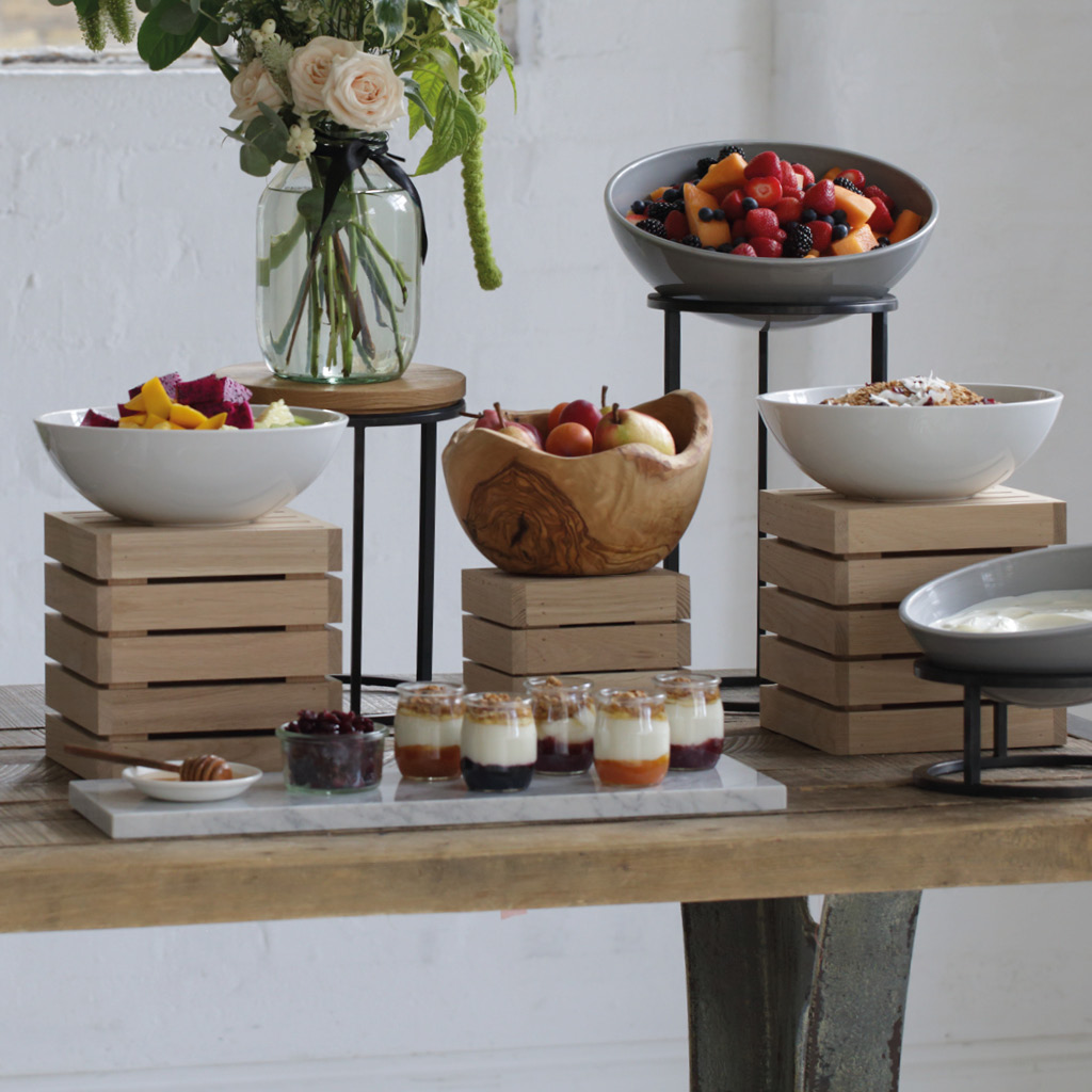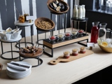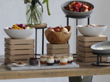 Sistemi za prezentaciju (Risers i Postolja): Modularni drveni i metalni elementi različitih visina dizajnirani da unesu dinamiku na vaš švedski sto. Lako se kombinuju, pružajući čvrst i vizuelno upečatljiv oslonac za vaše kulinarske kreacije.